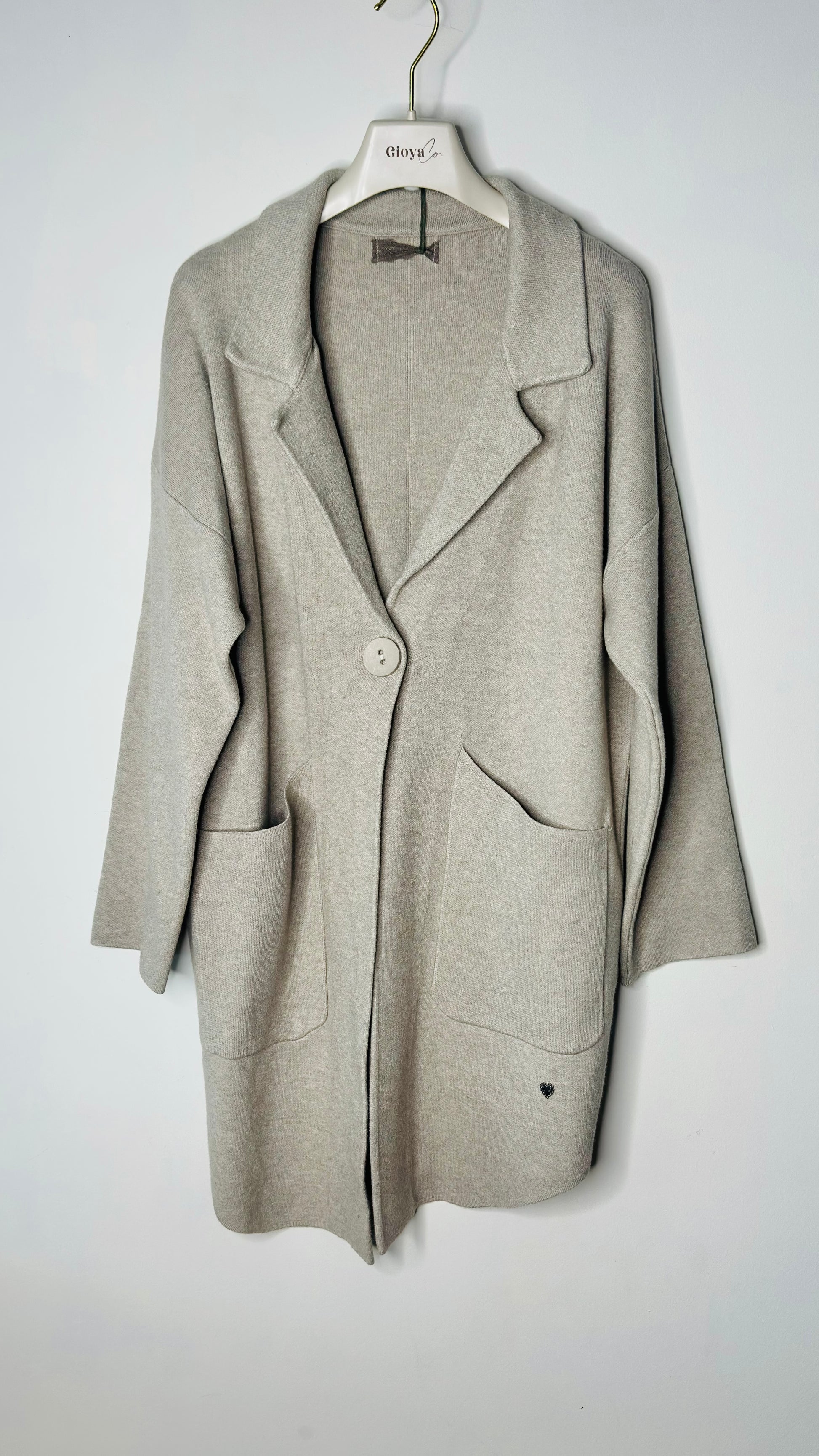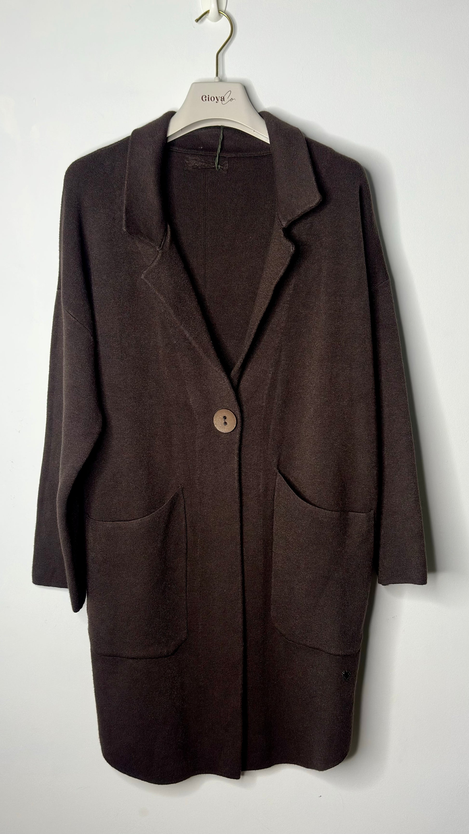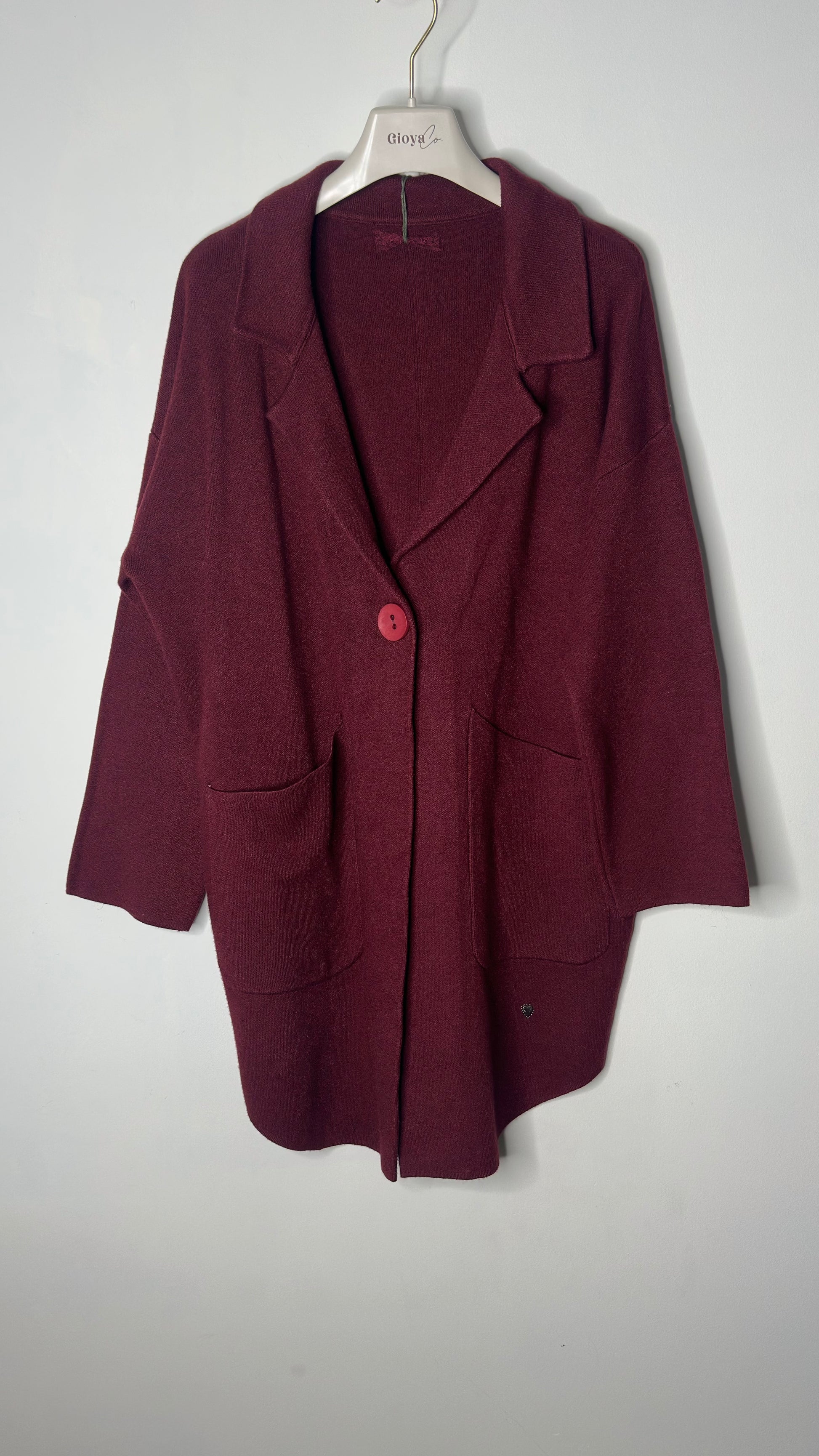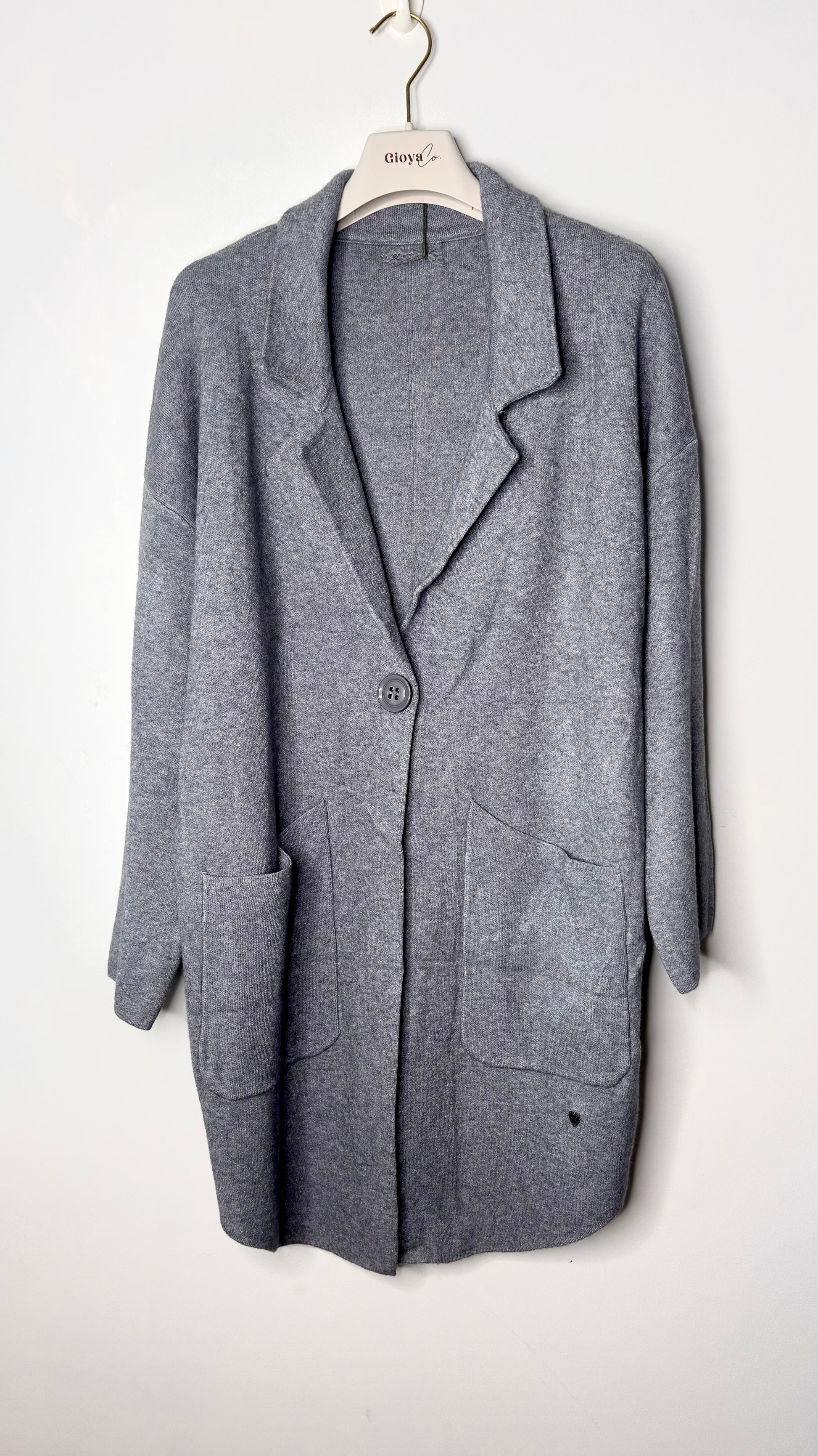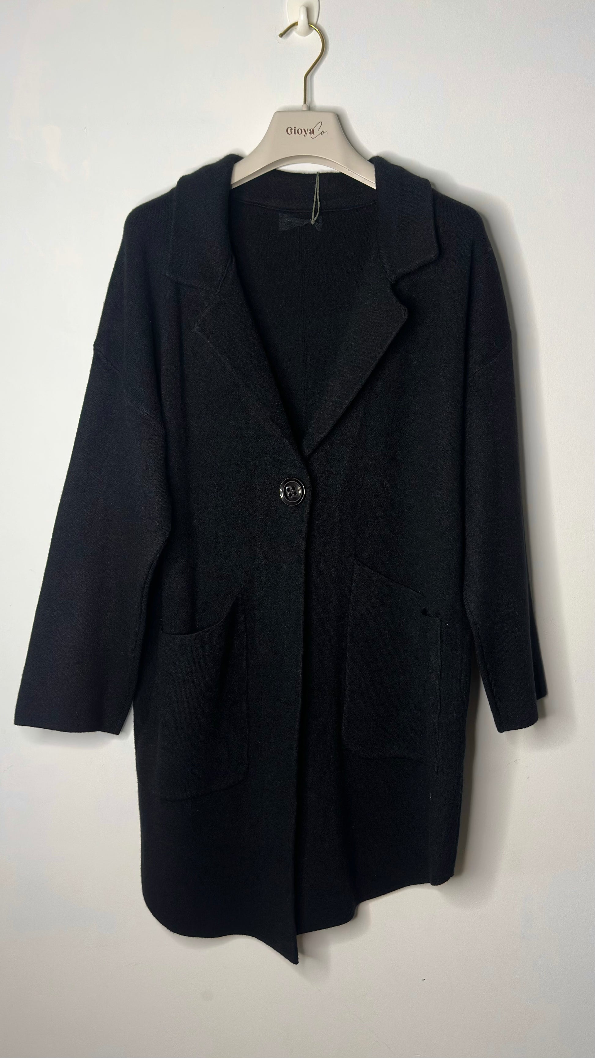 Oversized knitted cardigan, lapel collar with plastic button, ruffled sleeves and pockets.