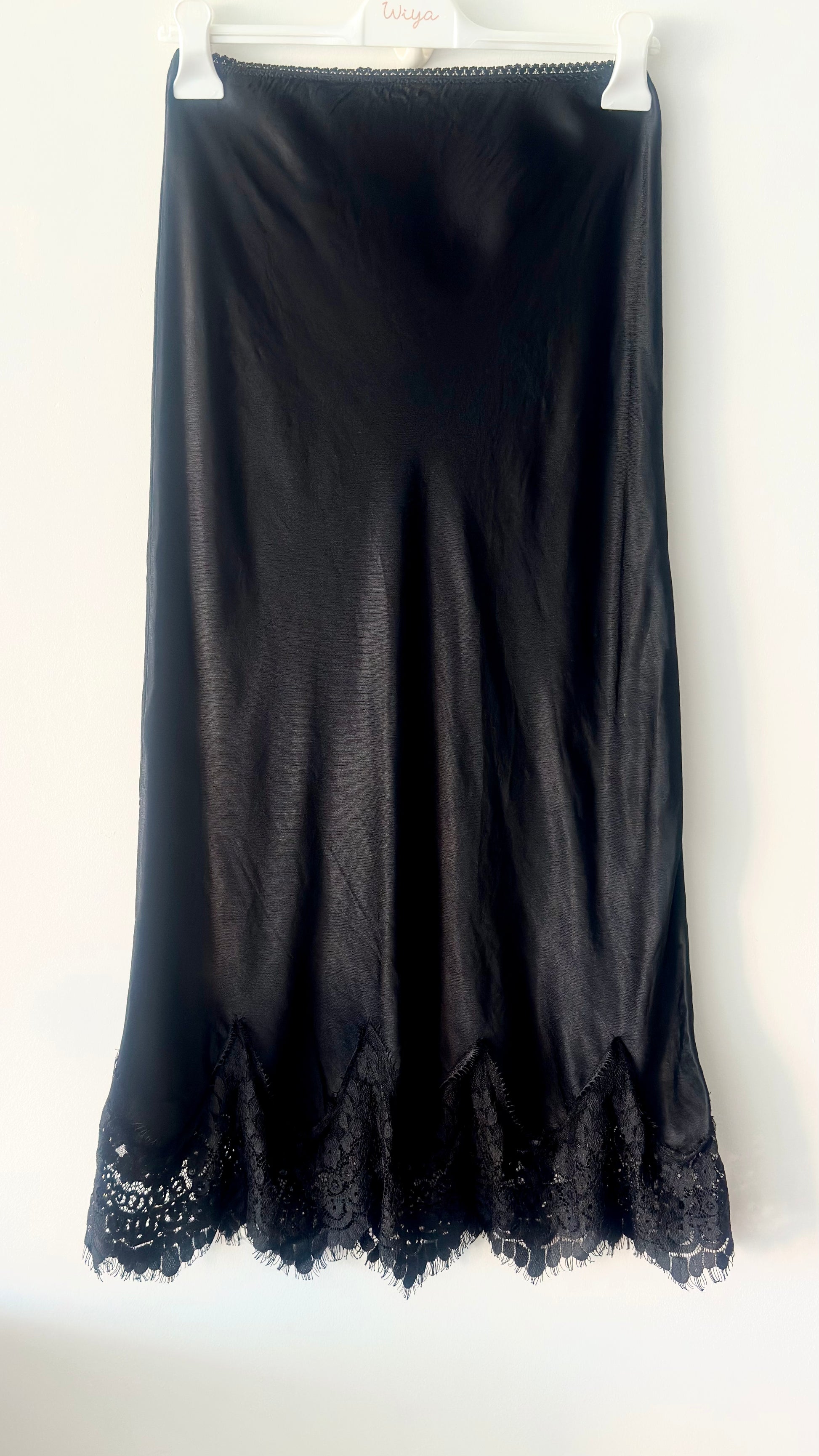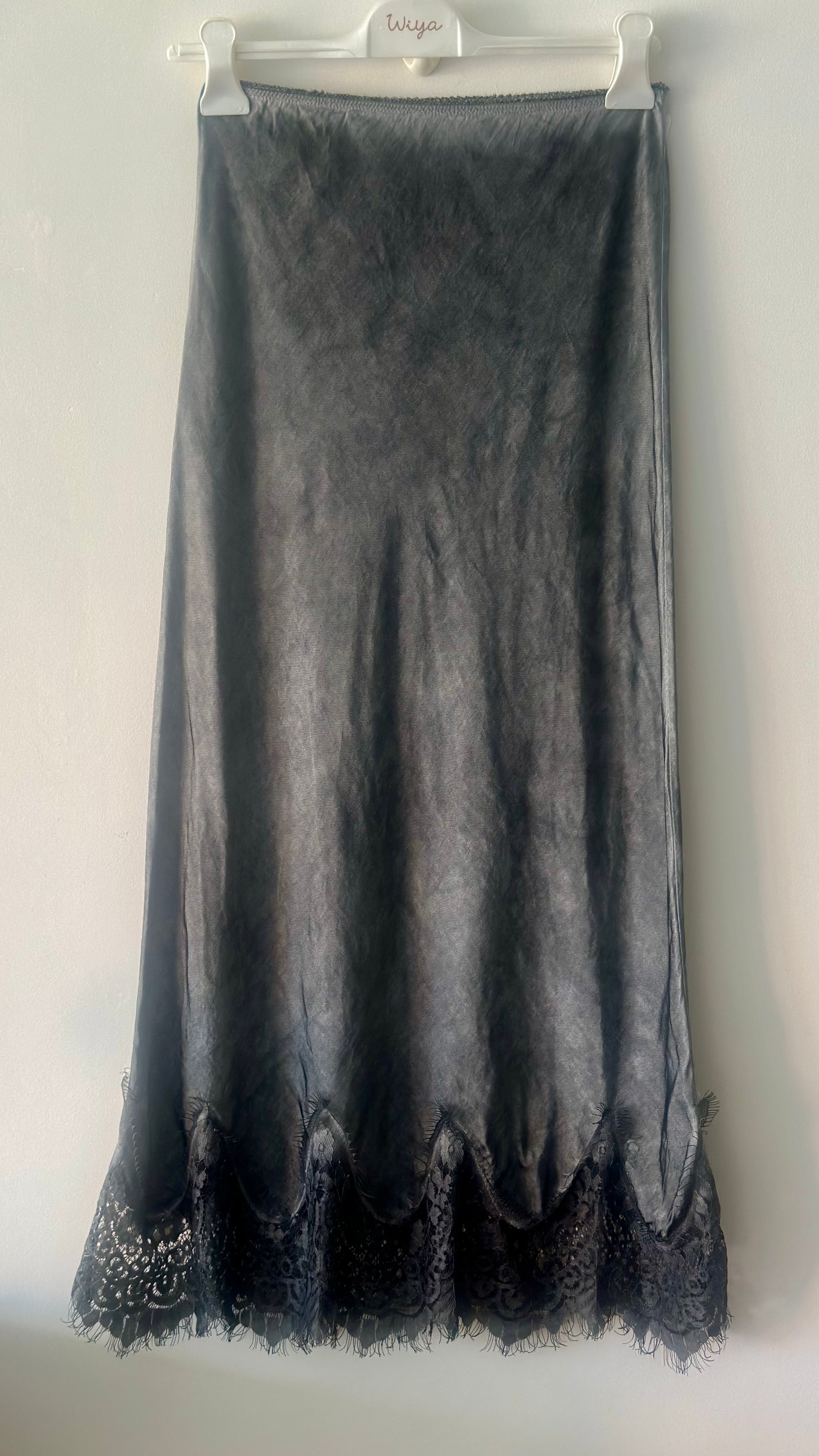 Washed satin skirt with lace trim. Elastic waistband.