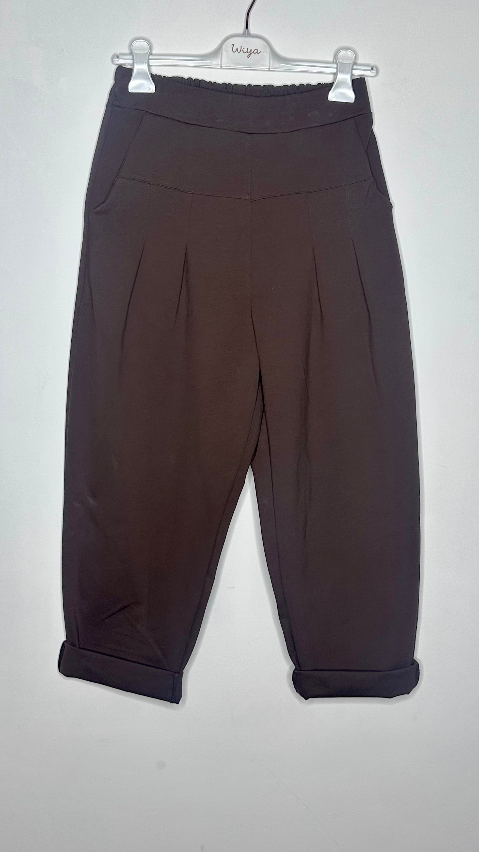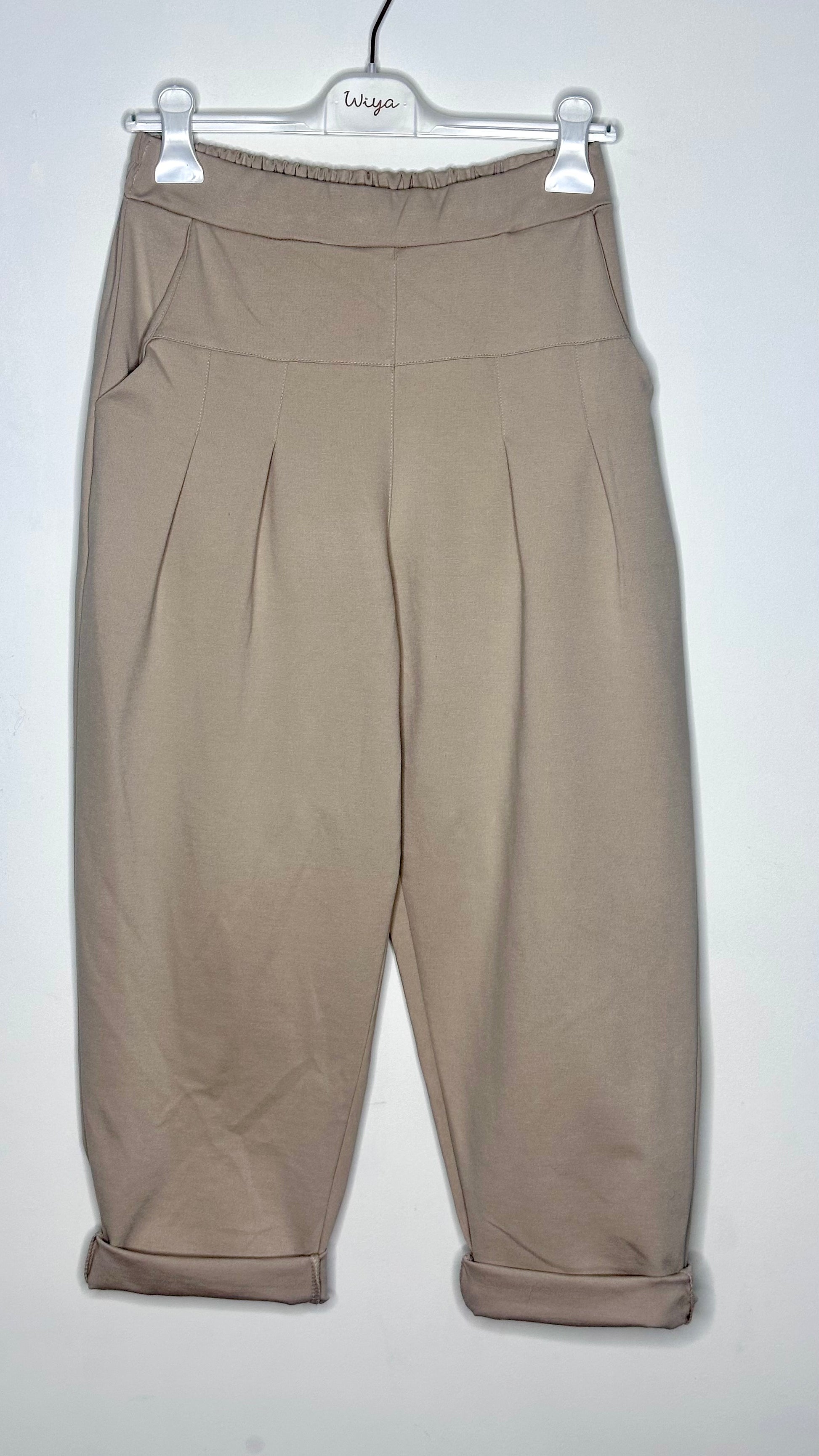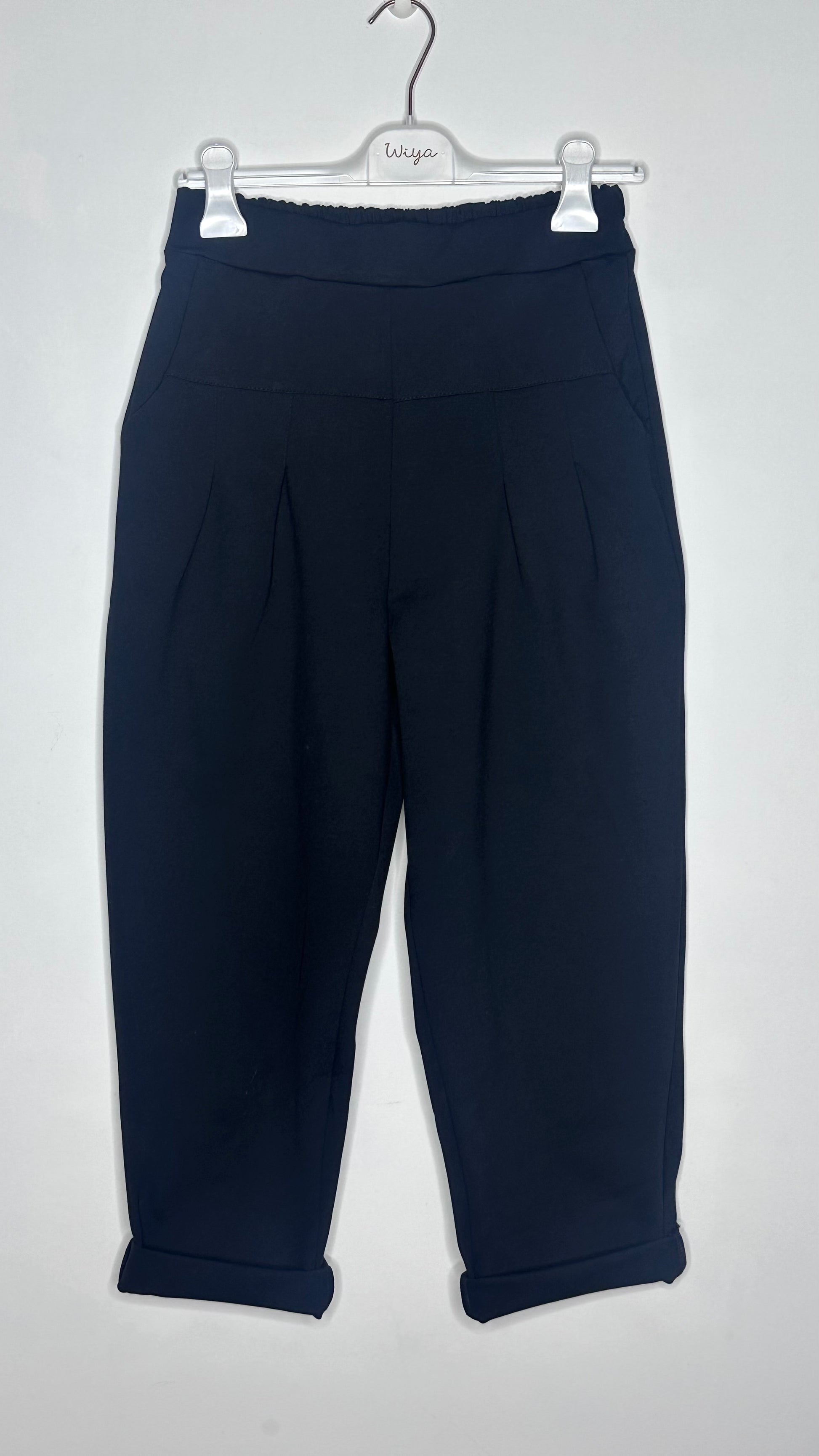 Roma knit trousers with side pockets and elastic at the back of the waist with two sewn darts.