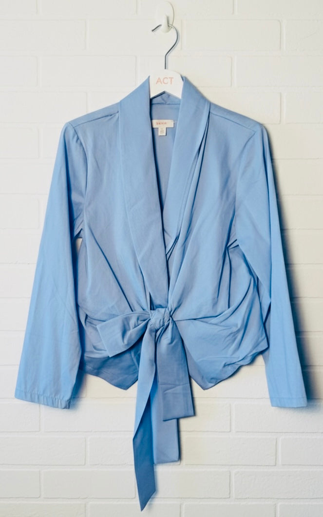 Camisa de corte particular y sofisticado con manga larga cuello esmoquin y lazada en el delantero.
