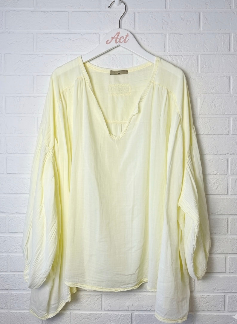Blusa Oversize conefecto desgastado,escote en V y mangas abollonadas, que aporta movimiento y comodidad. Con sutil fruncido en el pecho.