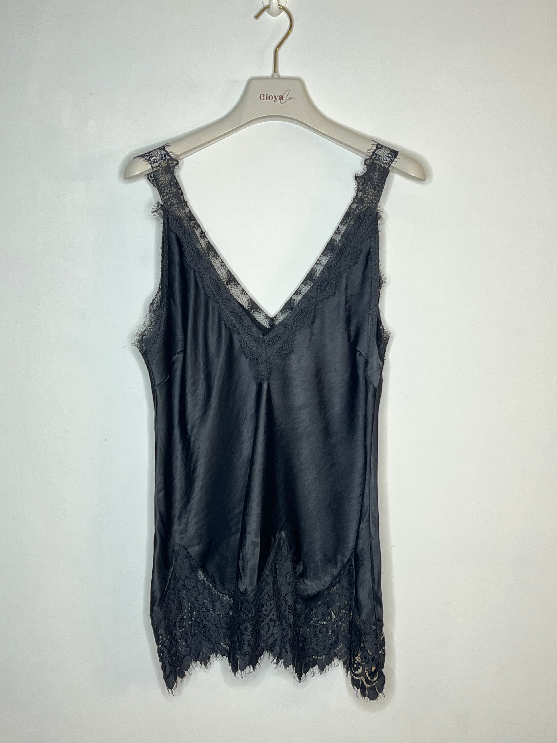 Top lecero de raso lavado con tirante ancho de puntilla y puntilla en el bajo.